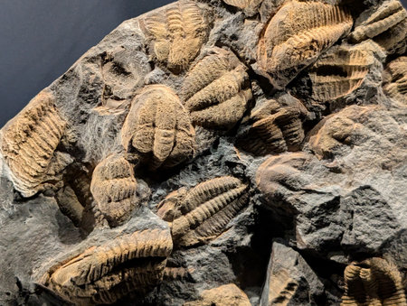 Detailed macro shot of fossil imprints on a weathered limestone rock, capturing the texture and timeless essence of Earth's ancient past.