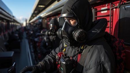 Portrait of a rescue man in a gas mask standing on the platform of station. Generative AI.