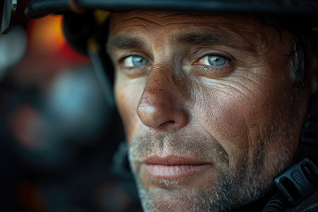 A close-up of a seasoned firefighter's face, marked by experience, with the reflective light of a fire casting a somber mood over his features. A.I.