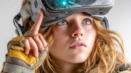 Close-up portrait of a young woman with tousled hair wearing futuristic VR goggles, looking upward with curiosity.