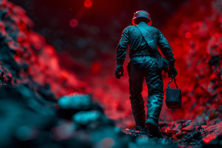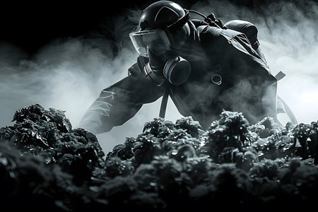 A figure in full protective gear, including a gas mask and suit, works amidst a smoky, potentially hazardous environment. the scene mes of industrial safety, environmental cleanup, and protection against toxic substances. Generative AI