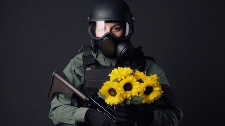 Soldier in gas mask with a bouquet of sunflowers