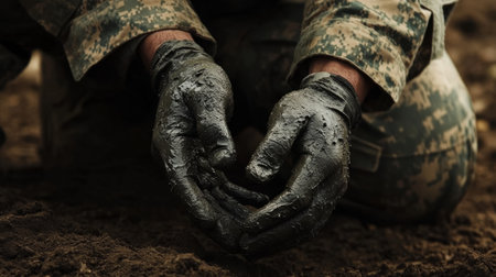 Soldier applying camouflage paint on his hands while kneeling on the ground generative ai