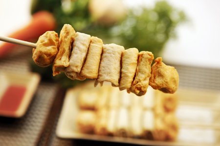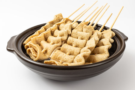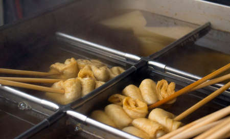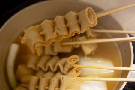Jakarta, Indonesia on 3 Nov 2025. Savory oden simmers in metal trays, featuring fish cakes and assorted ingredients, with wooden skewers, creating an appetizing display for culinary and travel content.