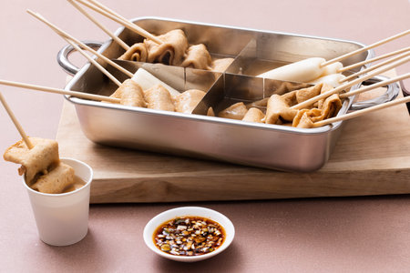 Korean street food. a delicious Asian street food, South Korea street food, Korea local food oden fish cake