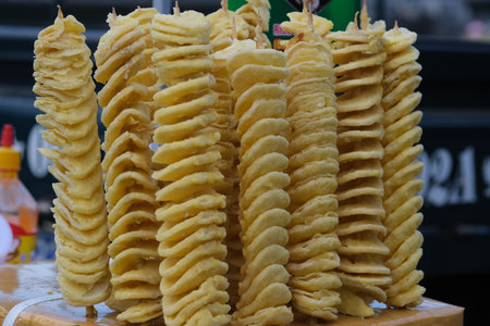 tornado potatoes, a popular Korean street food, are displayed on a rectangular white plate. Each potato is thinly sliced in a spiral shape and deep-fried on a skewer.