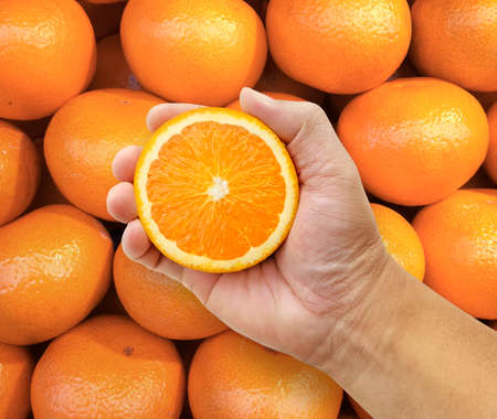 girl's hand holding half of orange over yellow background. fresh fruits concept. summer juice or smoothie making. children meal for vitamin supply.