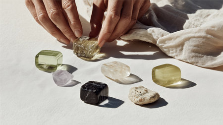 Hands arrange different stones on a light surface near a fabric
