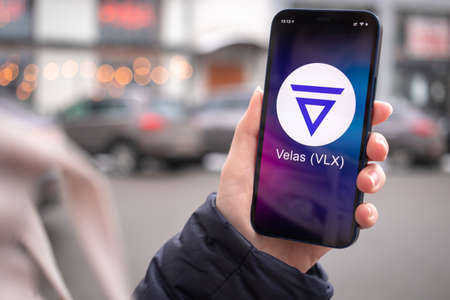 Kharkov, Ukraine - February 2, 2022: Velas VLX coin symbol. Trade with cryptocurrency, digital and virtual money, mobile banking. Hand with smartphone, screen with crypto icon close-up