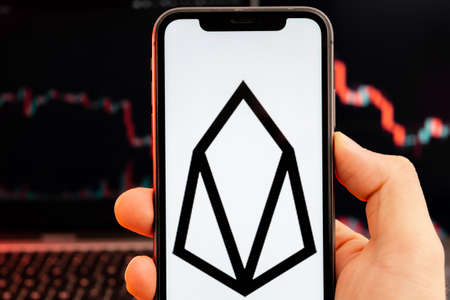EOS app of cryptocurrency stock market analysis on the screen of mobile phone in man hands and downtrend charts trading data on the background, February 2022, San Francisco, USA.