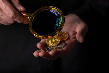 Shiny golden and silver coins of cryptocurrency in male hand palm with magnifying glass, loupe over black background, close up. Pile of bitcoin and other crypto.