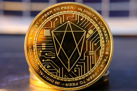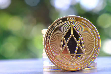 The Coin cryptocurrency EOS on the background of a stack of coins.