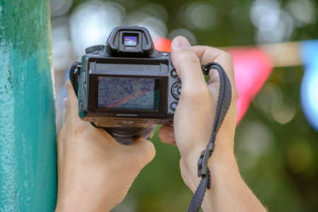 Photographer taking photo with camera in the forest. Nature photography concept.