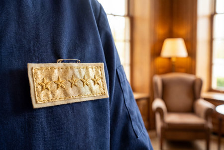 A close up view shows a blue uniform jacket featuring a handmade gold fabric badge with five embroidered stars attached by a safety pin against a blurred wooden interior background.