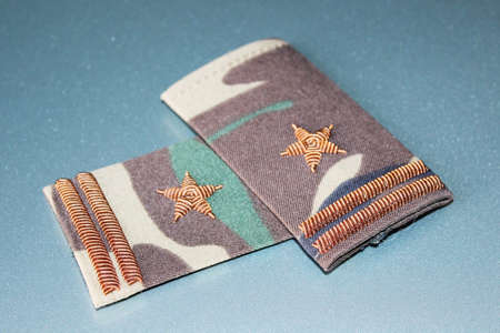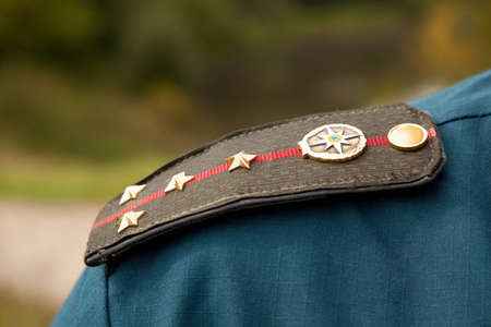 Samara, Russia - May 28, 2016: Shoulder straps with insignia on the bailiff's uniform. Selective focus