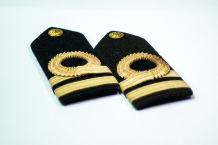 A pair of epaulette gold bar second officers, isolated on white tilted side by side front view