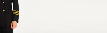 Close up unrecognizable serious African American mature bearded male man guy marine sailor elegant suit uniform plain gray background. Captain cruise ship pilot navigation safe transportation flying