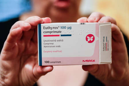 Bucharest, Romania - June 4, 2020: Details with Euthyrox medicine, a cure for Hypothyroidism.