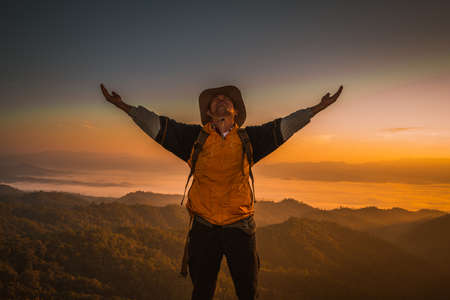 Man praying on the mountains raised hands Travel Lifestyle spiritual relaxation emotional concept, Freedom and travel adventure.