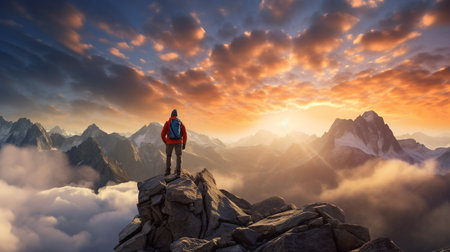 A lone climber standing on a mountain peak at sunrise, capturing breathtaking panoramic views and vibrant colors