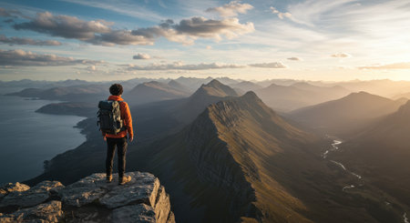 A hiker stands on a dramatic cliff overlooking a majestic mountain range and coastline at sunrise. This breathtaking view evokes a sense of freedom and achievement.