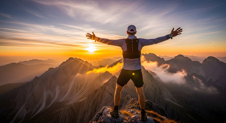 A triumphant male hiker or trail runner stands on a mountain peak with his arms outstretched, embracing the stunning sunrise view over a vast mountain range. This inspirational image symbolizes achievement, freedom, success, and the joy of reaching a personal goal.