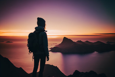 Man standing on top of a mountain and looking at the sunset. Ai generated