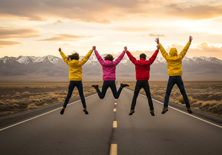 Four young adults in vibrant jackets (yellow, pink, red) are mid-air, joyfully jumping on a paved road against a backdrop of majestic snow-capped mountains at sunset. Generative Ai