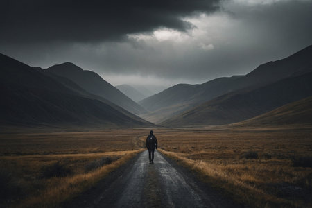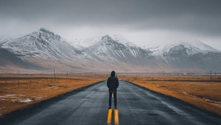 A person stands on a road, facing a mountain range under a cloudy sky. The image displays cool tones, with a vast landscape of yellow-brown fields and snow-capped peaks. The composition emphasizes depth, with a solitary figure. Suitable for various editorial and commercial projects that require dramatic visual.