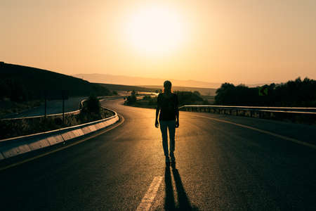 Digital composite of Woman walking on the road in the mountains at sunset