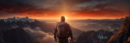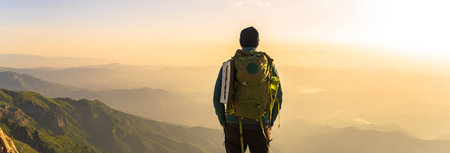 Success man hiker hiking on sunrise mountain peak