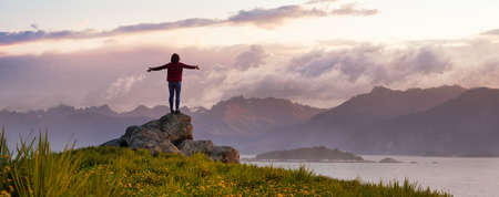 Adventurous Adult Woman Hiker on top of Rocky Mountain with hands open. 3D Rendering Peak. Sunset Sky. Background from British Columbia, Canada. Adventure Sport Concept