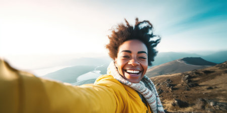 African hiker woman taking selfie portrait on the top of mountain, Happy woman smiling at camera, Tourism, sport life style and social media influencer.