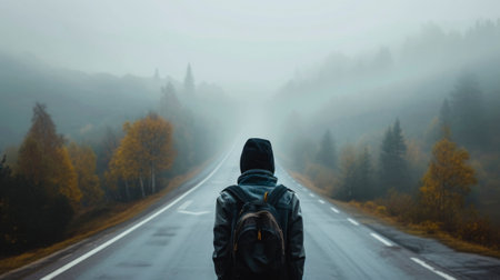 a traveler standing on empty misty road, Looking at the back of a hooded figure looking out on a moody foggy winters day.