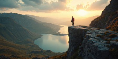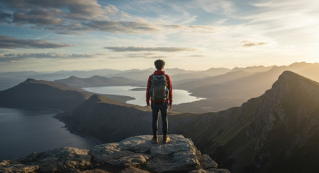 A solitary hiker stands on a rocky mountain peak, gazing at a breathtaking panoramic landscape of lakes and valleys, illuminated by golden light.