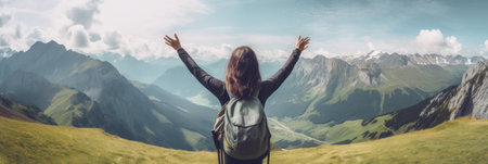 Young hiker backpacker female rising her arms