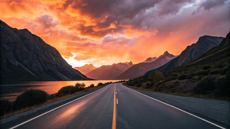 Experience the serene beauty of a winding road under a vibrant sunset, with majestic mountains in the distance and calm water reflecting the colorful sky.