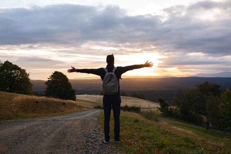 the young traveler stands with his arms outstretched at dawn. Duszniki Zdroj. Hills