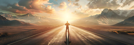 Businessman walking on asphalt road with mountains in background. Mixed media