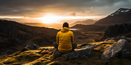 Man in yellow jacket sitting on a rock with mountains in the background