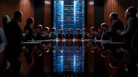 Silhouette of businessmen standing in a modern corporation and agreeing on business projects. Selective Focus