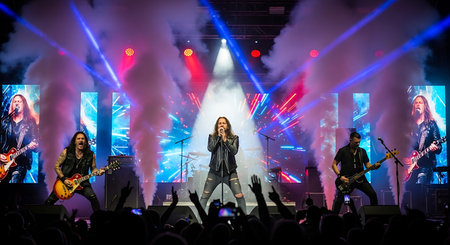 A dramatic scene of a rock band performing under pyrotechnic effects