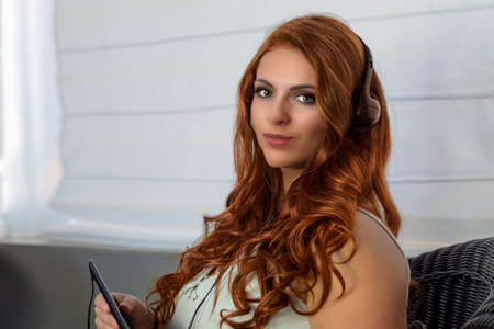 young woman listening to music with headphones beautiful redhead girl lifestyle