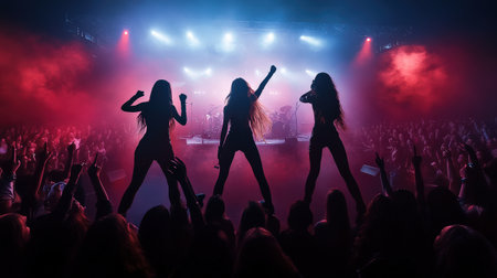 three girls group rock star performs on stage in front of a large crowd silhouette. Cyberpunk tone Bokeh