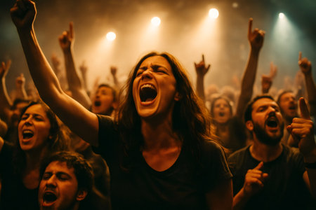 Crowd of people screaming, cheering, and raising arms, showing excitement and energy at a music event or protest