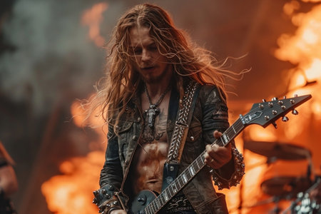 Heavy metal guitarist on fiery stage intense shredding mosh pit frenzy