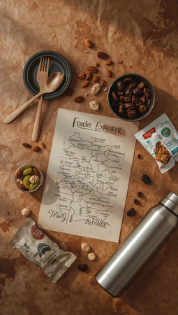 An overhead shot presents various food items, including bread, fruits, eggs, vegetables, and condiments. The composition utilizes natural lighting, emphasizing the textures and colors of the ingredients. This arrangement could be suitable for illustrating healthy eating, culinary concepts, or general lifestyle themes, and could be used for advertising or editorial content.