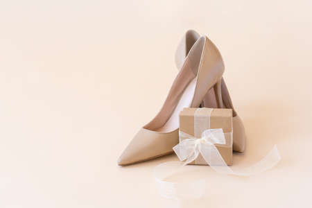 Classic beige women high heel shoes and gift box on pastel background. Minimal female background, banner. Fashion blog and sale concept.