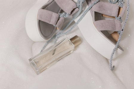 Beautiful new shoes of a young bride lie on a white cloth next to the perfume