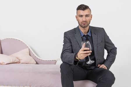 Handsome man in suit sits on bed with wine glass. Portrait of fashionable luxury man in his house. Confidence look of businessman